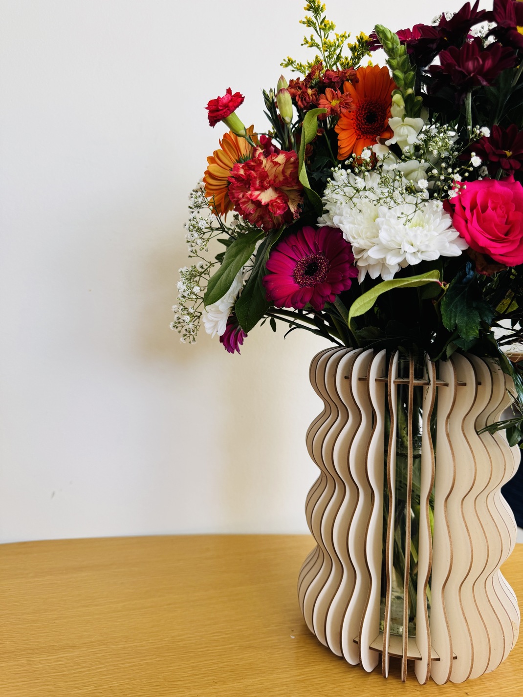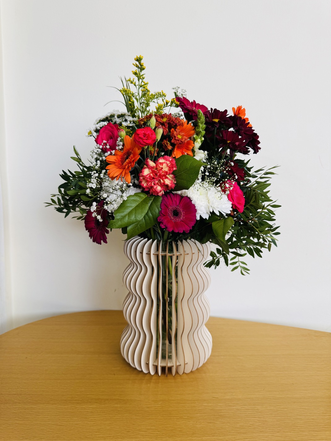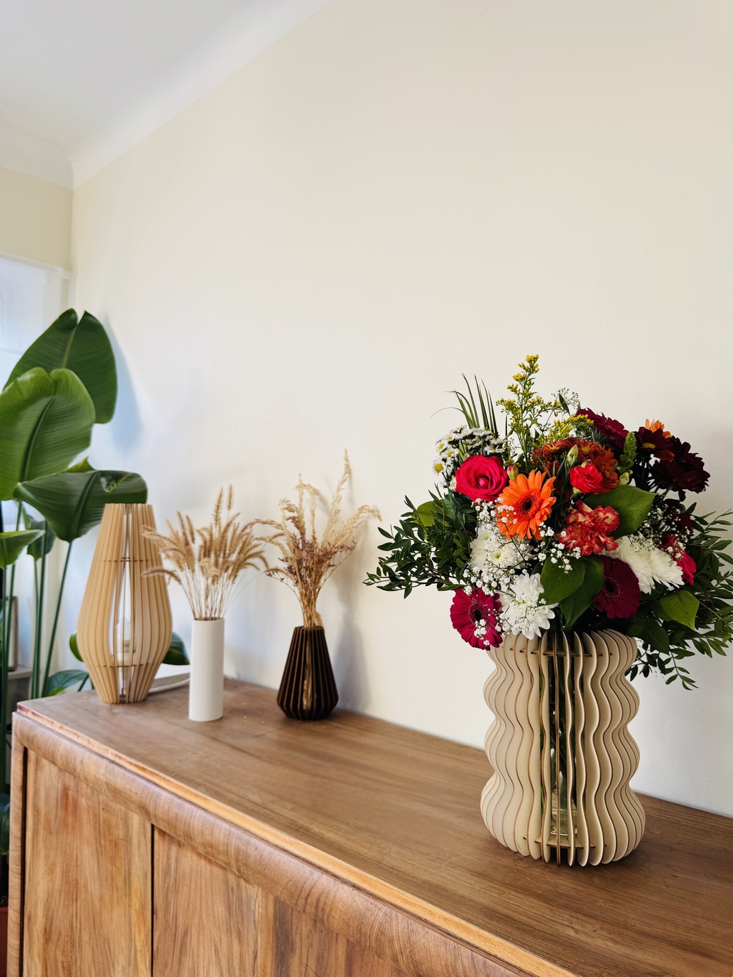 Clélia a imaginé ce vase haut où les arrondis se poursuivent dans les formes des fleurs du bouquet. Les tiges plongent dans le vase en verre qui se trouve au creux du vase en carton bois recyclé français.